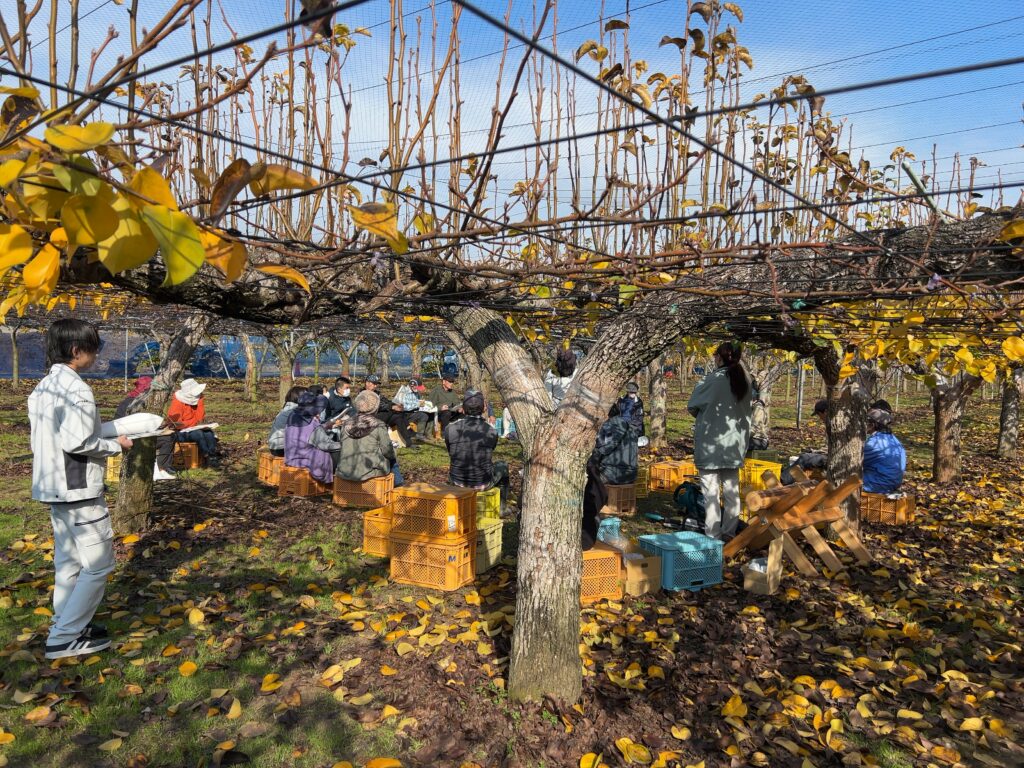 梨部会の方々に、一斉開花、着果に向けて、ゲキテンF&FとポーマンーLの葉面散布の仕方を説明させて頂きました。