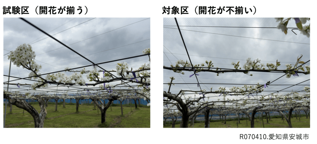 しかし、暑さで梨は夏バテしているので、花芽が充実しにくくなっているようですね。開花しやすくなるように樹勢を改善する。