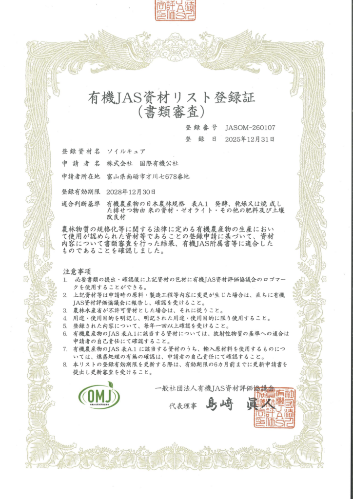 土壌改良剤(堆肥)ソイルキャアが有機JAS資材登録されましたので報告致します。「有機農産物の日本農林規格」の基準に適合する資材、どなたでも安心して有機農産物の生産に使用することができます。